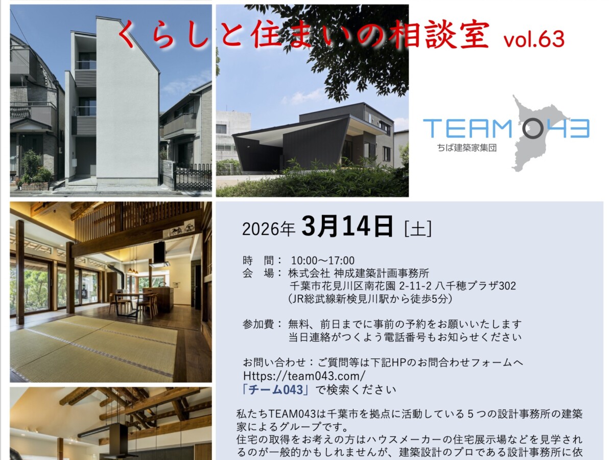 17Feb2026 お知らせ 2026年3月14日(土) くらしと住まいの相談室Vol.63を開催🏡 -参加無料です!- 新しい季節の訪れとともに、やわらかな春の光を感じる頃となりました。3月は、暮らしを見つめ直し、新しい一歩を踏み出すのにぴったりのタイミングです。 4月からの新生活を前に、「これからどんな暮らしをしたいか」をゆっくり考えてみませんか? 住まいは、家族の時間を育み、日々の安心を支える大切な場所。建築家との対話を...